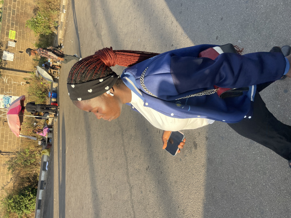 The scene depicts a street in Barakin Lerawi, Nigeria, illuminated by direct, low-angle sunlight. The primary subject, a young adult female with dark skin, walks across a paved road surface from left to right in the foreground. Her eyes are closed or heavily squinted, and her head is angled slightly to the right. She wears a black bandana patterned with small white hearts, covering the top of her head. Her hair, styled in braids, is gathered into a long, reddish-brown ponytail extending down her back. She is dressed in a white t-shirt, a blue varsity-style jacket with white buttons and trim, and black pants. A white wireless earbud is visible in her right ear. She holds a black smartphone, screen-down, in her right hand and carries a small, dark-colored purse with a red and white stripe detail, worn cross-body with a silver chain strap. In the mid-ground, a concrete curb separates the asphalt road from a verge of dry, overgrown vegetation. Behind this vegetation, a light-colored concrete block wall is visible, with several posters or flyers affixed to its surface. To the right of the main subject, further into the background, an informal vendor stall operates under a red and white striped umbrella. One individual, dressed in dark clothing, stands facing away from the camera behind the stall. Another individual, wearing pink or purple attire, is seated behind a low table, partially visible. Merchandise, including yellow bags, is arranged near the stall. Further to the right, another male individual walks away from the vendor area, dressed in a patterned shirt, dark pants, and a dark baseball cap. Shadows are long and extend towards the left, indicative of either early morning or late afternoon sun.