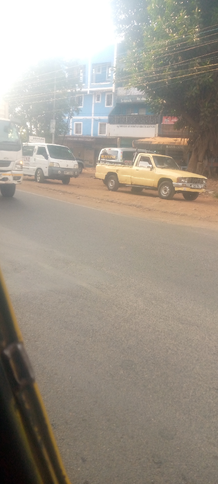 The image features a street scene with several vehicles, including a white truck, a white van with "ROYVINE" branding, and a yellow pickup truck, also with "ROYVINE" signage. In the background, a light blue building is visible, displaying signs for "branch No dep" and "EBENEZER INTEGRATED BERITE SERVICES". Adjacent to the building is a sign for "MAFRA CHP". The license plate of the yellow truck appears to read "RVS 50%". The overall scene is somewhat overexposed with bright sunlight.