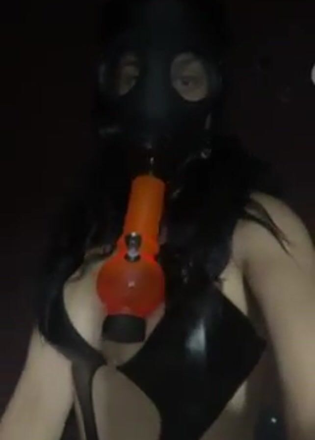A woman with long black hair wearing a black latex top and a black gas mask stands in front of a dark background with small white circular stickers. She holds a small orange bong and lights it with a lighter.