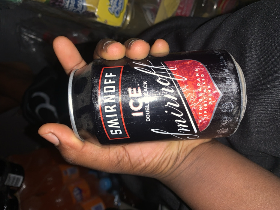 - "The image depicts a close-up view of a dark-skinned human hand holding a black Smirnoff Ice Double Black spirit mixed drink can, set in Kubwa, Nigeria" by FM-dbVwo1, licensed under CC BY 4.0