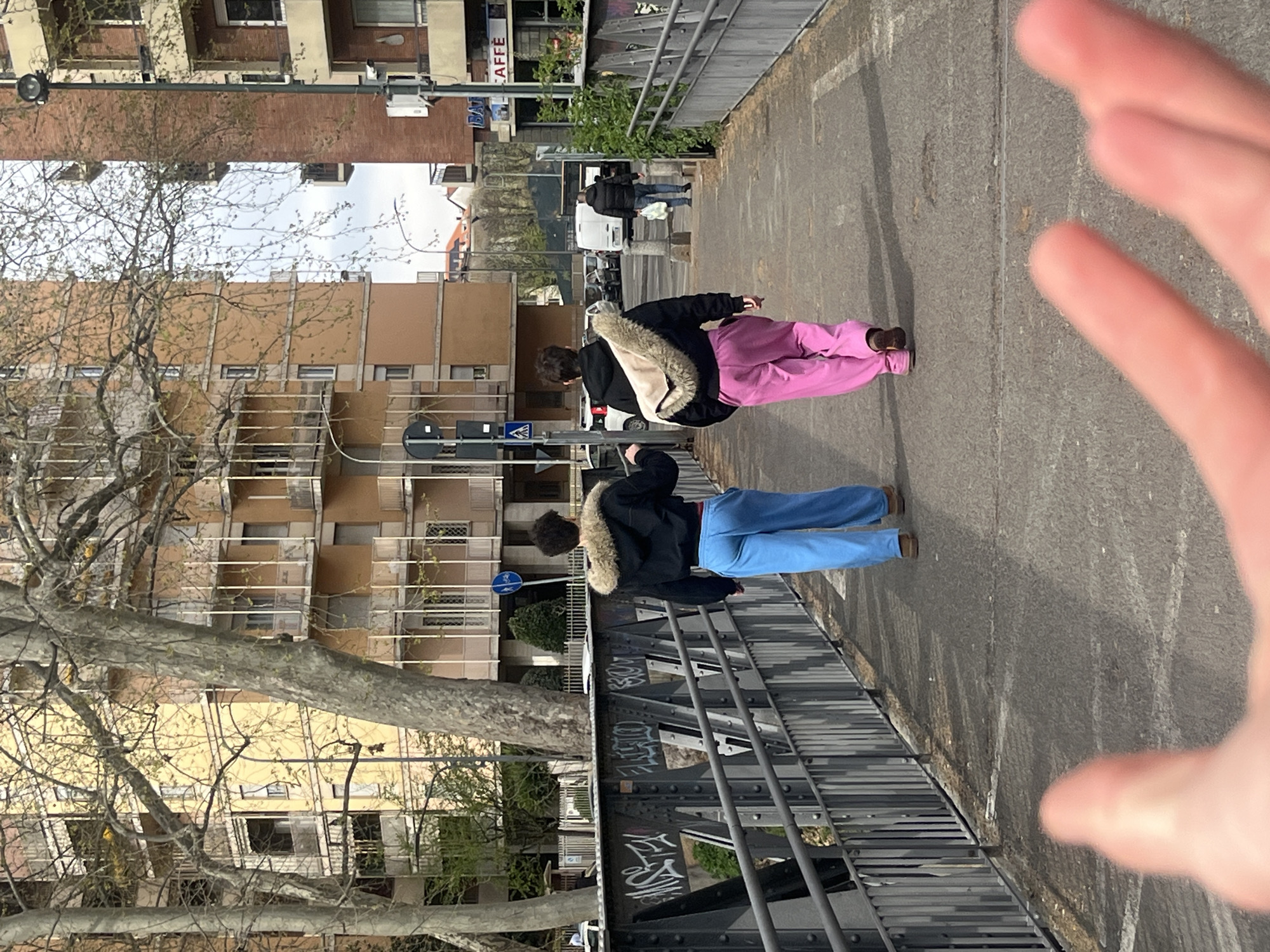 This daytime image depicts an urban street scene in Turin, Italy, viewed from a low perspective, with two blurred hands partially visible in the foreground. Two individuals are walking away from the camera on a paved pedestrian path that constitutes part of a metal bridge structure. The person on the left wears a black hooded jacket with a light-colored fur-lined hood and bright blue loose-fitting trousers. The person on the right wears a black hooded jacket, a light-colored fur accessory draped over their right shoulder, and bright pink loose-fitting trousers. Both are wearing dark, possibly brown, shoes. The path they are on features faded white markings. To their immediate left, a dark grey metal bridge railing, adorned with graffiti, runs parallel to the path. In the background, beyond the bridge railing and path, the scene transitions to an urban environment. Multi-story residential buildings with balconies dominate the landscape. On the left, several bare-branched trees (likely plane trees) partially obscure light orange/beige buildings. A street is visible beneath, with parked vehicles and traffic signs. On the right, a reddish-brown brick building with windows and balconies is prominent, featuring a sign that reads "CAFFE" and partially "BAT" below it. Further down the path, a third individual, a male in a dark jacket and jeans, walks towards the camera, carrying a white bag. A white van and other cars are visible on a street in the distant background. The sky is light, suggesting an overcast day or haze, and the bare trees indicate late winter or early spring.