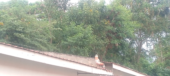 building roof with a chimney in the center. The roof is painted white with brown tiling along the edges. Behind the roof, a dense collection of trees stretches upwards, filling the top portion of the image. The trees feature varied shades of green and yellow blossoms, indicating healthy foliage. The sky is visible in small patches between the trees, suggesting a slightly overcast day.