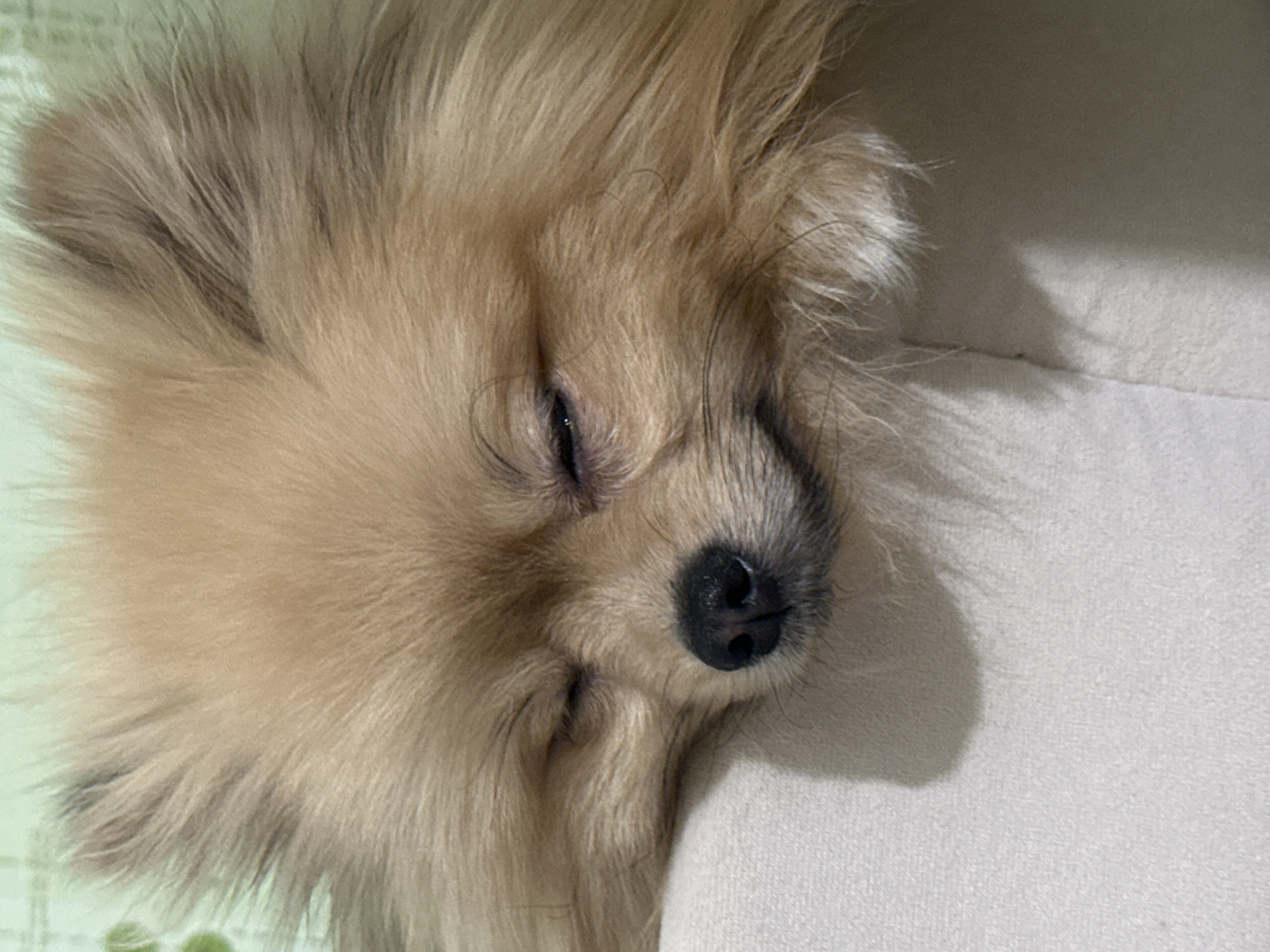 A close-up, rotated, indoor shot of a sleeping Pomeranian dog