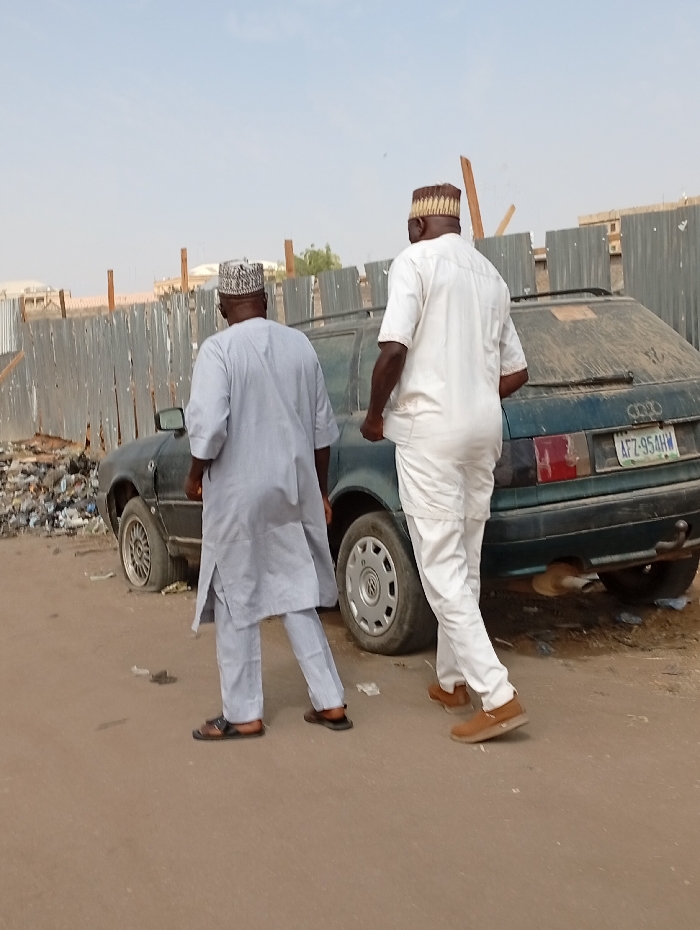 In Sabon Gari East, Nigeria, two adult males are observed walking from left to right across an unpaved, dusty ground surface. The individual on the left wears a light grey traditional tunic, matching trousers, and dark sandals, topped with a patterned cap. The individual on the right wears a white traditional tunic, matching trousers, and light brown shoes, topped with a brown patterned cap. Both are seen from behind. To their right, a dark green or blue-green four-door sedan, identified as an Audi by visible badging, is parked facing away from the viewer. The vehicle, bearing Nigerian license plate AFZ-954HW, appears heavily soiled and in disrepair; its rear left tire is either deflated or missing, while the rear right wheel has a silver hubcap. A tow hitch is present on the rear bumper. Behind the vehicle, a corrugated metal sheet fence, appearing weathered and partially damaged, extends horizontally across the mid-ground. Adjacent to the vehicle's left side and against the fence, a pile of assorted refuse is visible. Distant buildings are discernible on the horizon above the fence line under a clear, light blue sky.