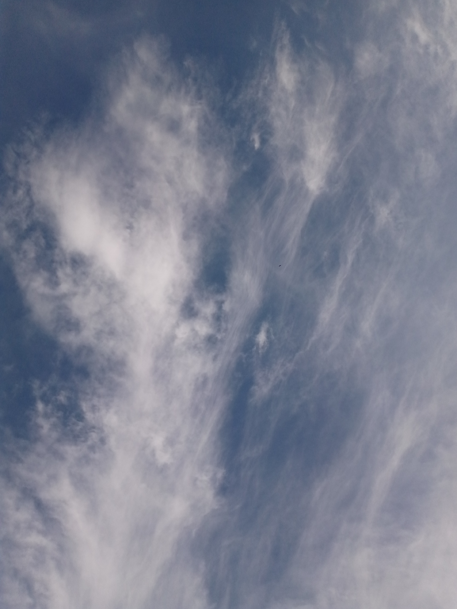 daytime sky with blue coloration visible between white clouds. The clouds are mostly cirrus, appearing thin and wispy, with some cumulus clouds present in the lower left of the frame. A small, dark speck that might be a bird or other small airborne object is visible against the blue sky and a few wisps. No other people, subjects, or objects are observable. The environment is a blue sky with clouds. The location in the city of Las Guevaras, Venezuela is unknown, as there is no other visible content that indicates this.