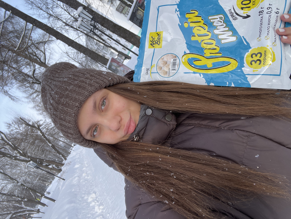 A young adult female is depicted taking a selfie in a snowy, outdoor park-like environment in Chaikovsky, Russia. She has long, straight, dark brown hair with visible snowflakes, light-colored eyes, and wears a dark brown ribbed knit beanie and a dark brown padded winter jacket. She is looking directly at the camera with a slight pout. In her right hand, she holds a large, light blue and white plastic package labeled "Not Bad Protein Whey" in English and Russian, displaying nutritional information (33 servings, 18g protein, 0.9g fat, 6g carbohydrates) and an image of small, round, white food items. Her fingernails are painted white. The background features a snow-covered incline, numerous bare deciduous trees, and two ornate, dark-colored lampposts. Distant multi-story buildings are partially visible through the trees on the right side of the frame. The entire scene is covered in a substantial layer of white snow under bright, natural light, indicative of winter conditions.