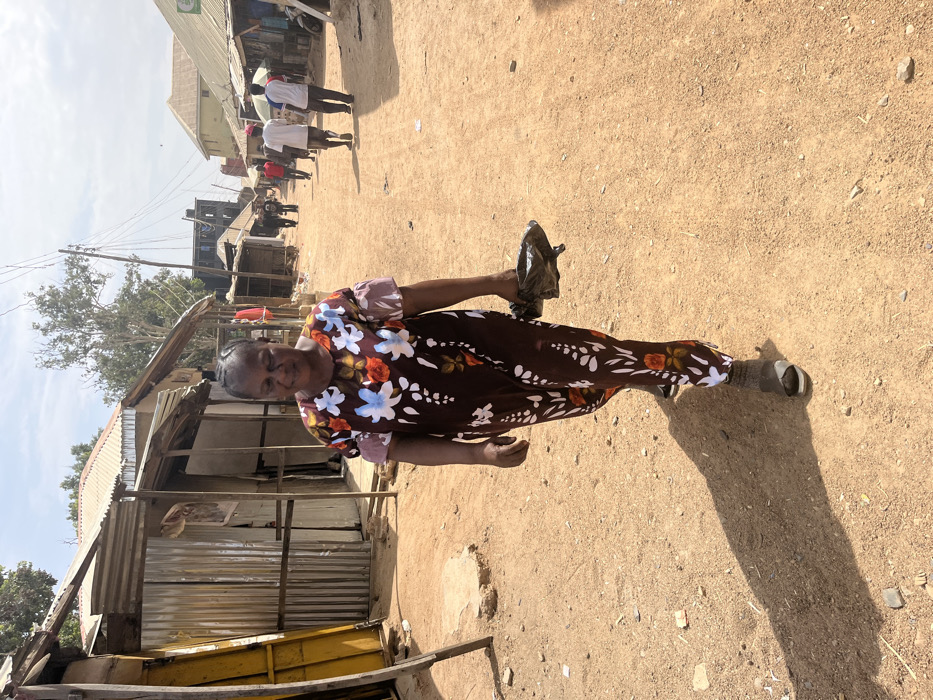 An adult woman walks along an unpaved, reddish-brown dirt street in Rafin Par, Nigeria, under a bright, hazy sky