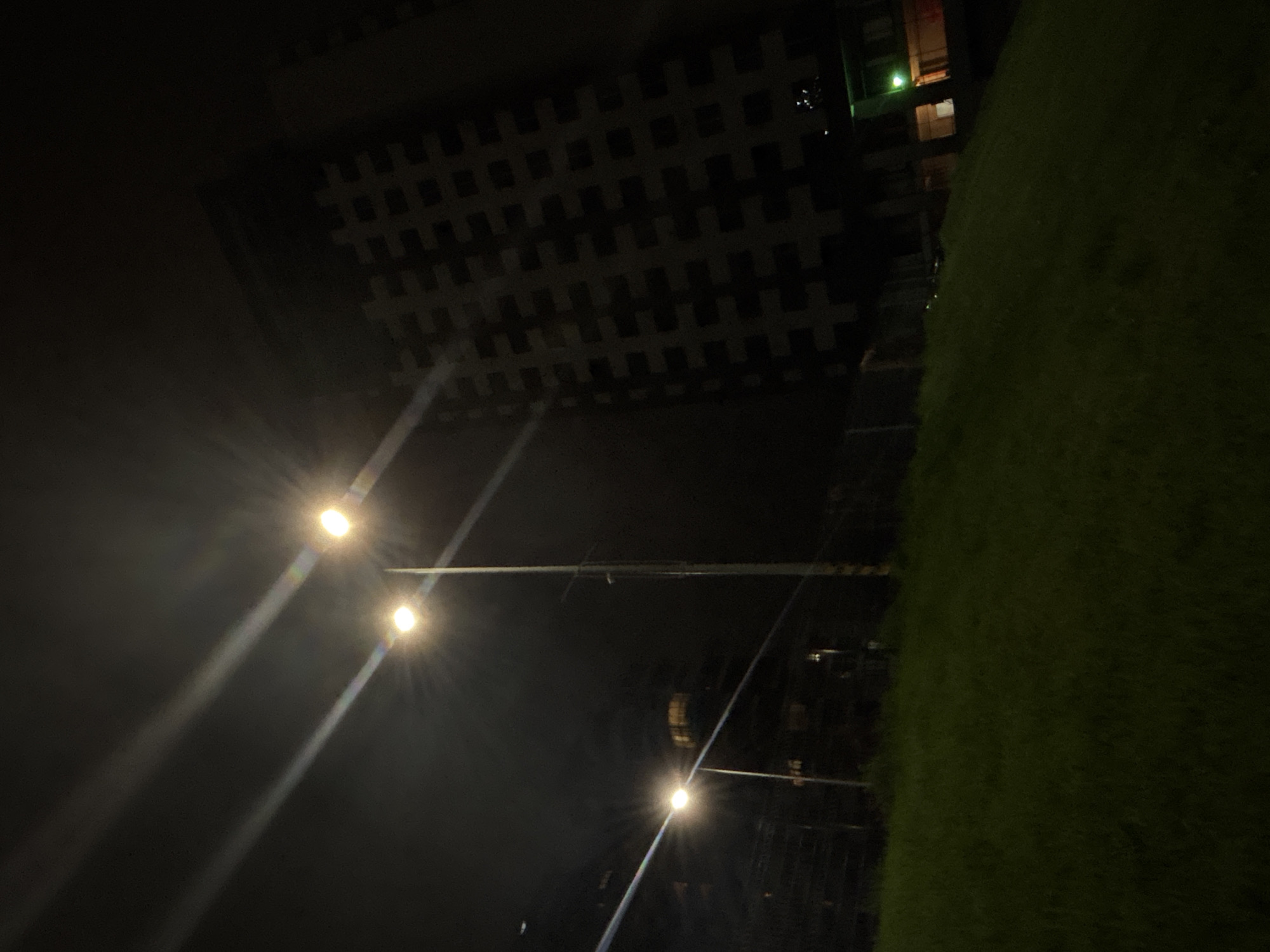 nighttime scene, likely in an urban environment. A tall building with a patterned facade is visible in the upper part of the frame. Streetlights illuminate the area, with their light casting distinct beams. To the right of the building, there is a patch of grass or vegetation. There are no people visible.