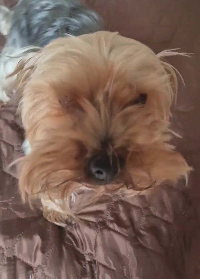 - ". The video shows a person petting a Yorkshire Terrier on a brown quilted surface. The terrier is laying down and appears sleepy or relaxed. The person's hand, with a bright pink nail polish, is seen petting the dog's head and neck. Another Yorkshire Terrier, with darker fur, is standing nearby. The person is wearing a light beige jacket." by FM-WH1aF2, licensed under CC BY 4.0
