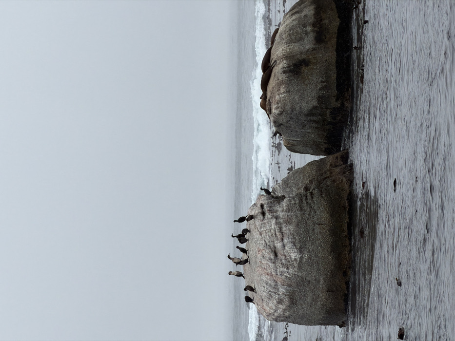 The image depicts a coastal scene in Hout Bay, South Africa, under an overcast, light grey sky. Two large, dark grey rock formations are partially submerged in the choppy ocean water. The larger, left rock supports approximately 15-18 dark-feathered cormorants perched in various resting postures. The right rock, slightly lower and darker, has approximately 6-7 dark-furred Cape fur seals lying huddled together on its upper surface. White-capped waves extend across the ocean in the mid-ground towards a distant, hazy horizon. The foreground water is dark, rippled, and contains scattered smaller dark rocks and strands of floating kelp. No human presence or artificial structures are visible.