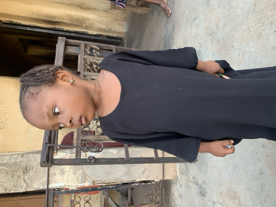 The image captures a young child standing outdoors in Okene, Nigeria