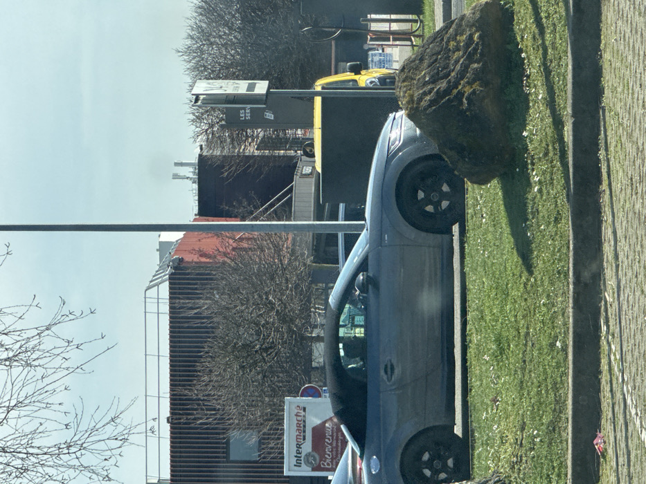 An outdoor scene in Oberhausbergen, France, depicts an urban environment under a clear, light blue sky. In the foreground, a patch of green grass with scattered white debris is observed, bordered by a concrete curb. A large, irregular dark brown rock covered in moss is positioned on the right side of the grass, casting a shadow. In the midground, a dark grey Audi TT convertible, with its black soft top raised, is oriented facing right, possibly stationary or moving slowly. The vehicle features black multi-spoke wheels. A single individual, wearing a dark cap, is visible in the driver's seat. Behind the Audi, partially obscured, a yellow van is present. A prominent tall, slender metal pole stands vertically near the center-left. To the left, a white sign with "Intermarché" and "BIENVENUE" is visible, alongside a partially obscured red circular road sign. To the right, another black and white sign displays "LES SERV" and a fuel pump icon. The background features several buildings, including one with vertical dark red cladding and a flat roof with a metal railing. A rectangular window is visible on this structure. Adjacent to and behind these buildings are bare deciduous trees and bushes, indicative of late winter or early spring. Communication towers are discernible on the distant horizon/rooftops. Bare tree branches are also visible in the upper left quadrant of the image.