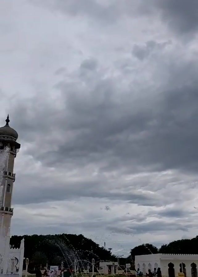 tall, slender, light-colored tower with a bulbous dome at the top, rising from the center of a circular fountain. Water shoots up high in the air from the fountain, creating a tall spray. Smaller sprays of water arch outwards. The tower is surrounded by water, with dark-colored buildings and trees visible in the background. The sky is overcast with gray clouds. The camera pans up to reveal more of the tower and the sky.