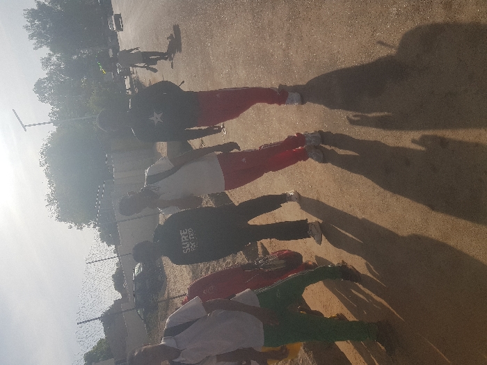 The image captures an outdoor scene in Jos, Nigeria, depicting five male individuals walking along a roadside path under bright daylight. The ground consists of a dirt/sandy surface transitioning to an asphalt road in the mid-ground. Long shadows are cast towards the viewer, indicating a low sun angle. In the foreground, four young males walk from left to right. 1. The leftmost individual wears a white polo shirt, green track pants, and a backpack. 2. Next to him, a male wears a black hooded sweatshirt with "SURE FOR TFD" in white text, black pants, white sneakers, and carries a red bag over his left shoulder. 3. The central figure wears a white polo shirt, red track pants with white stripes, white sneakers, and a backpack. 4. The rightmost foreground figure wears a black long-sleeved shirt with a white star emblem on the chest, red track pants, and white sneakers. In the background, on the paved road, a fifth male walks away from the camera, carrying an object. The environment includes a fence with a dark vehicle behind it on the left, and a solar-powered streetlight pole and trees on the right. Vehicles are visible further down the road.