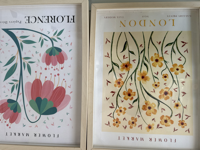 Two framed art prints, identified as "FLOWER MARKET" themed, are displayed side-by-side in Vila Nova de Gaia, Portugal