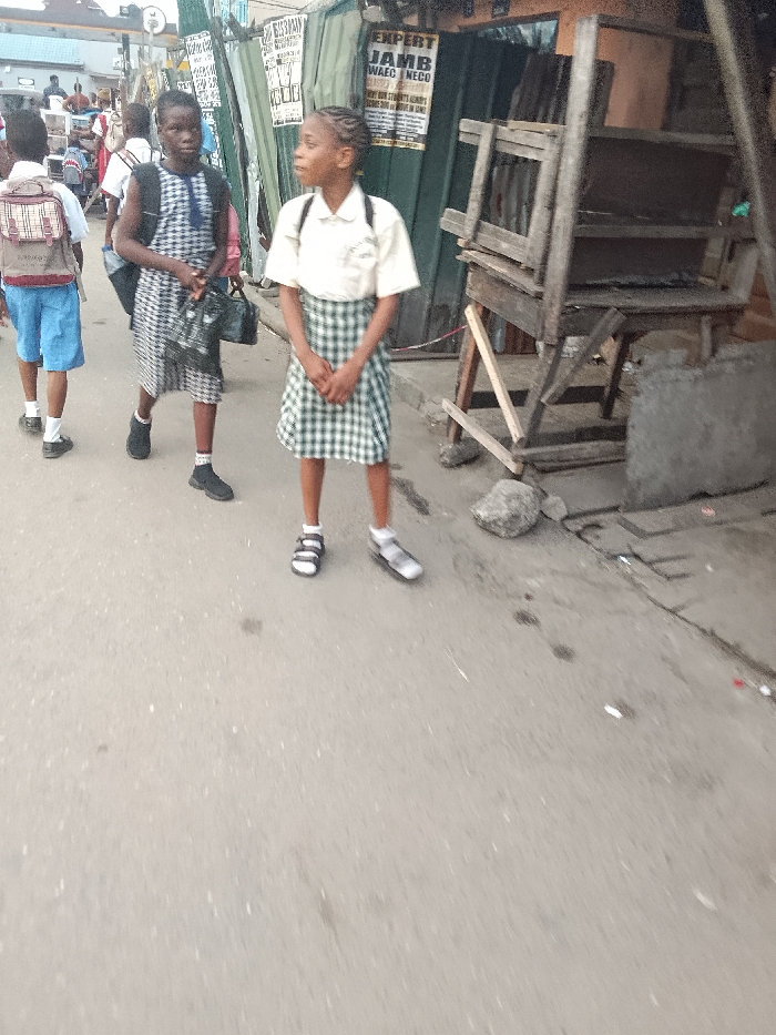 Three students in uniform walk along a gray street. The student in the middle wears a blue and white checkered dress and black sneakers. The student in the front wears a white shirt with a blue and white checkered skirt and white socks with sandals. To the right of the student in the front, there is a wooden structure. Above and behind the structure, a sign reads "EXPERT JAMB WAEC NECO." Litter is on the ground to the right.