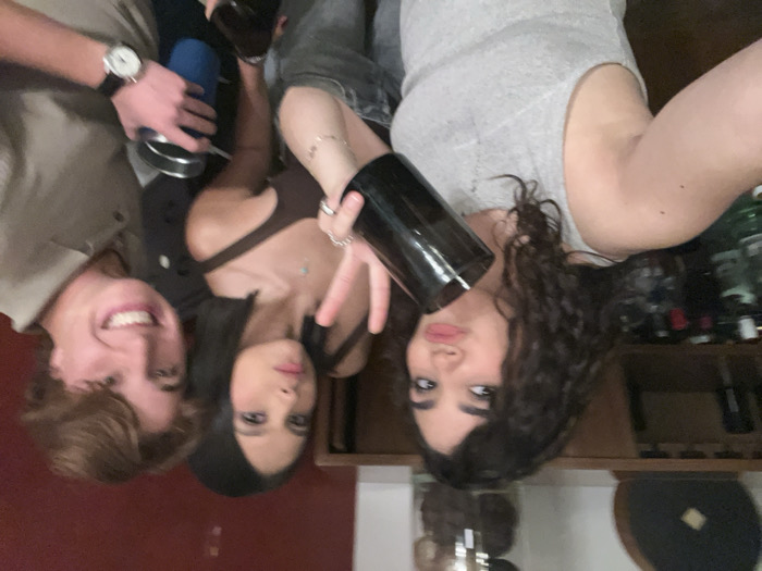 Three young adults pose closely in an rotated image. A fair-skinned male grins, wearing a watch and khaki shirt, holding a blue cup. Beside him, a dark-haired woman in a brown top flashes a peace sign. To her right, a curly-haired woman in a grey tank top holds a black bottle. Bottles are visible on a shelf behind her. The group appears to be at a bar or party.