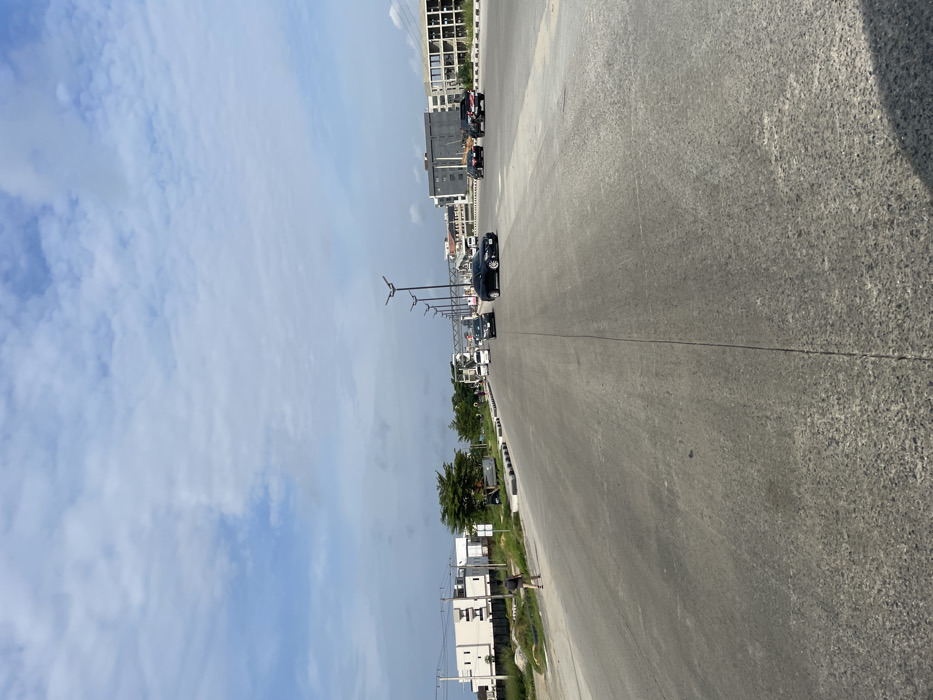 A straight paved road stretches into the distance, lined with streetlights and buildings of varying heights. Cars can be seen traveling along the road. The sky is filled with white clouds. The view is taken from one side of the road, looking towards the center. The pavement appears to have a coarse texture. Vegetation is visible alongside some of the buildings.