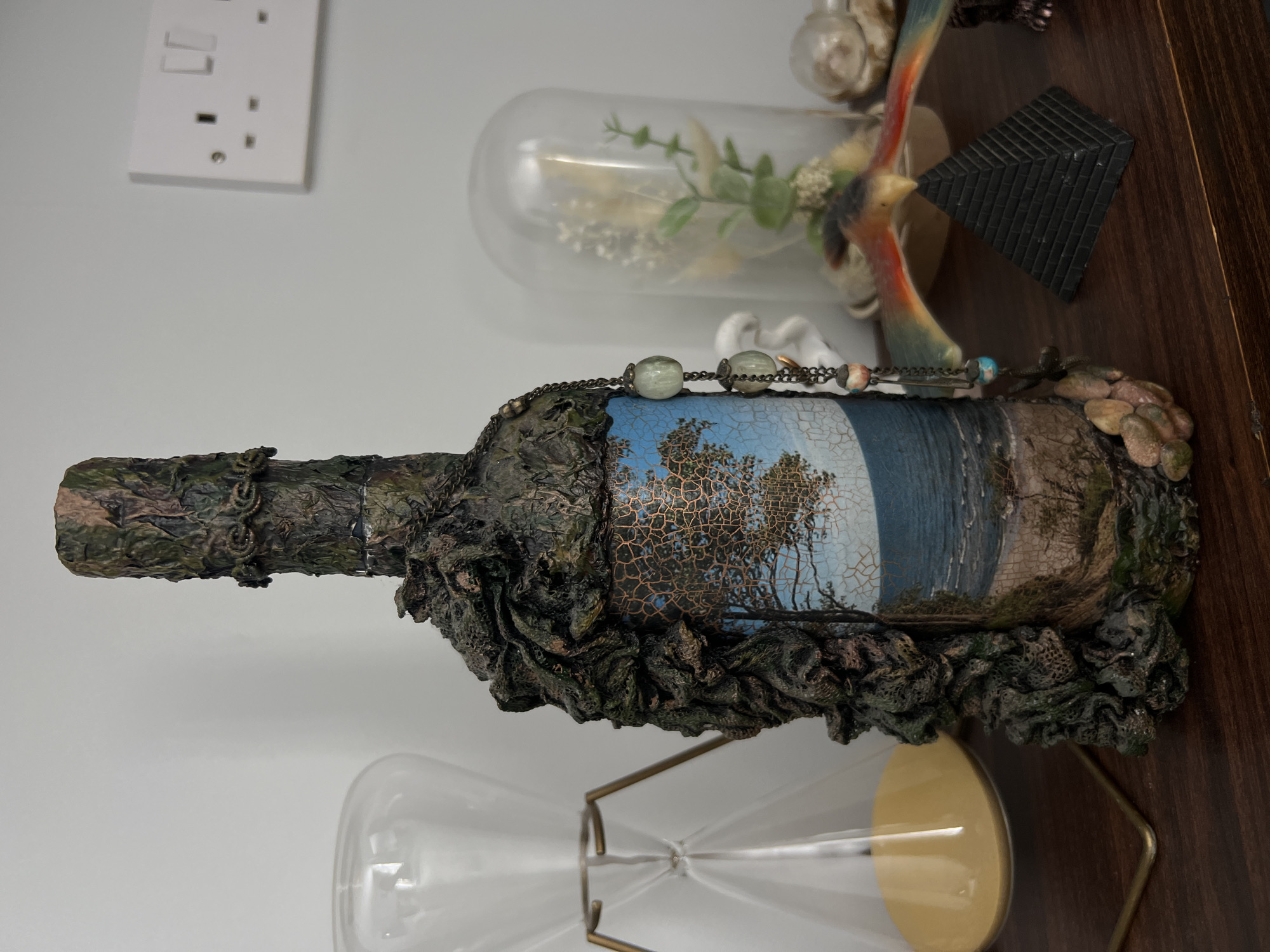 The image depicts an intricately decorated bottle on a shelf or table. The bottle is adorned with textured, dark green and brown material, possibly resembling sculpted clay or similar substance, covering most of its surface. A landscape image, featuring a beach with trees against a blue sky, is visible on the bottle. The bottle has a strand of beads wrapped around it. Behind the bottle are various decorative objects. A glass dome encases some small plants. A figurine of a bird is visible, along with a small, black pyramid-shaped object. Below the bottle is an hourglass with a metal frame. A white electrical outlet is visible in the upper-left background. There is no information in the image to suggest this object can be found in the city of Gorleston-on-Sea, United Kingdom.