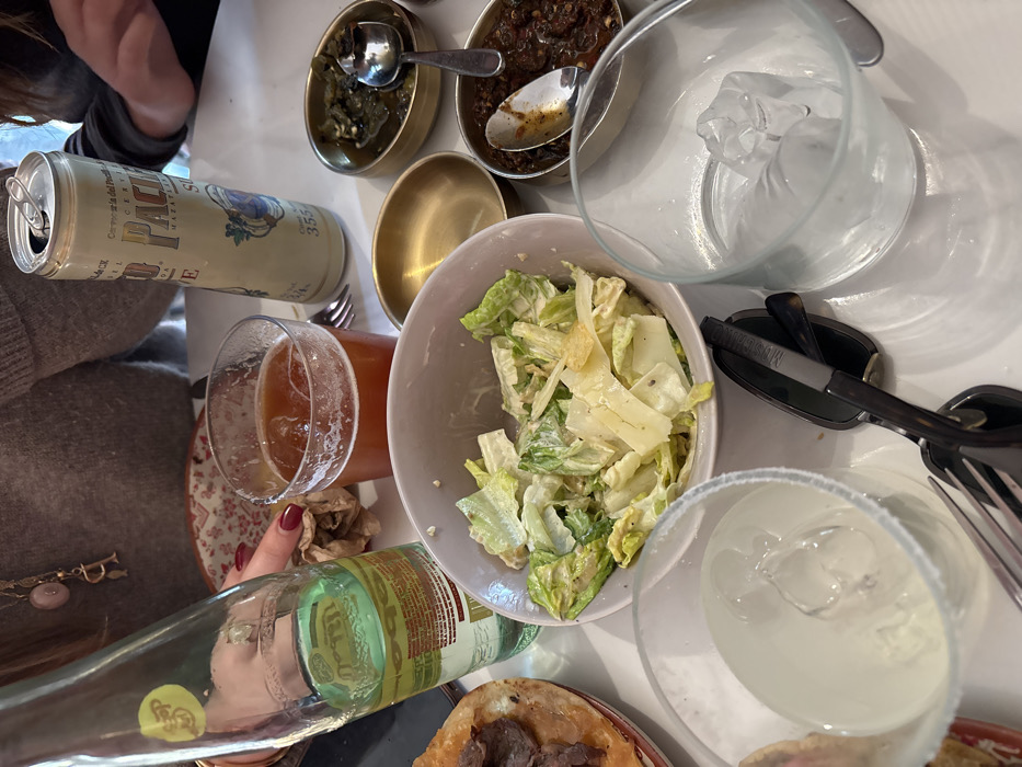 A cluttered table features a diverse array of food and beverages. A nearly finished Caesar salad sits centrally, surrounded by small bowls containing various sauces. Beverages include a can of beer, a glass of amber liquid, and a salt-rimmed glass of clear liquid. An empty glass with ice rests near black cutlery. A green glass bottle lays horizontally near a woman's hand. The table suggests a casual, shared meal.