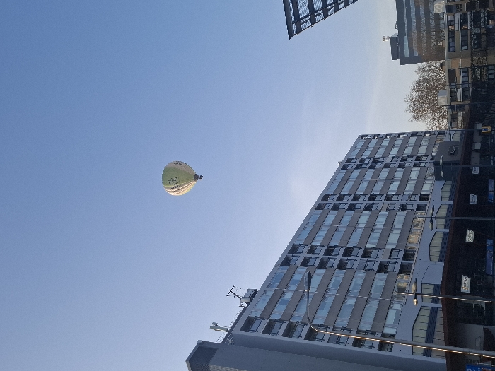 - "A light green hot air balloon with unidentifiable white text markings is visible high in a clear, cloudless blue sky, positioned slightly right of the image's center" by FM-RADEm2, licensed under CC BY 4.0