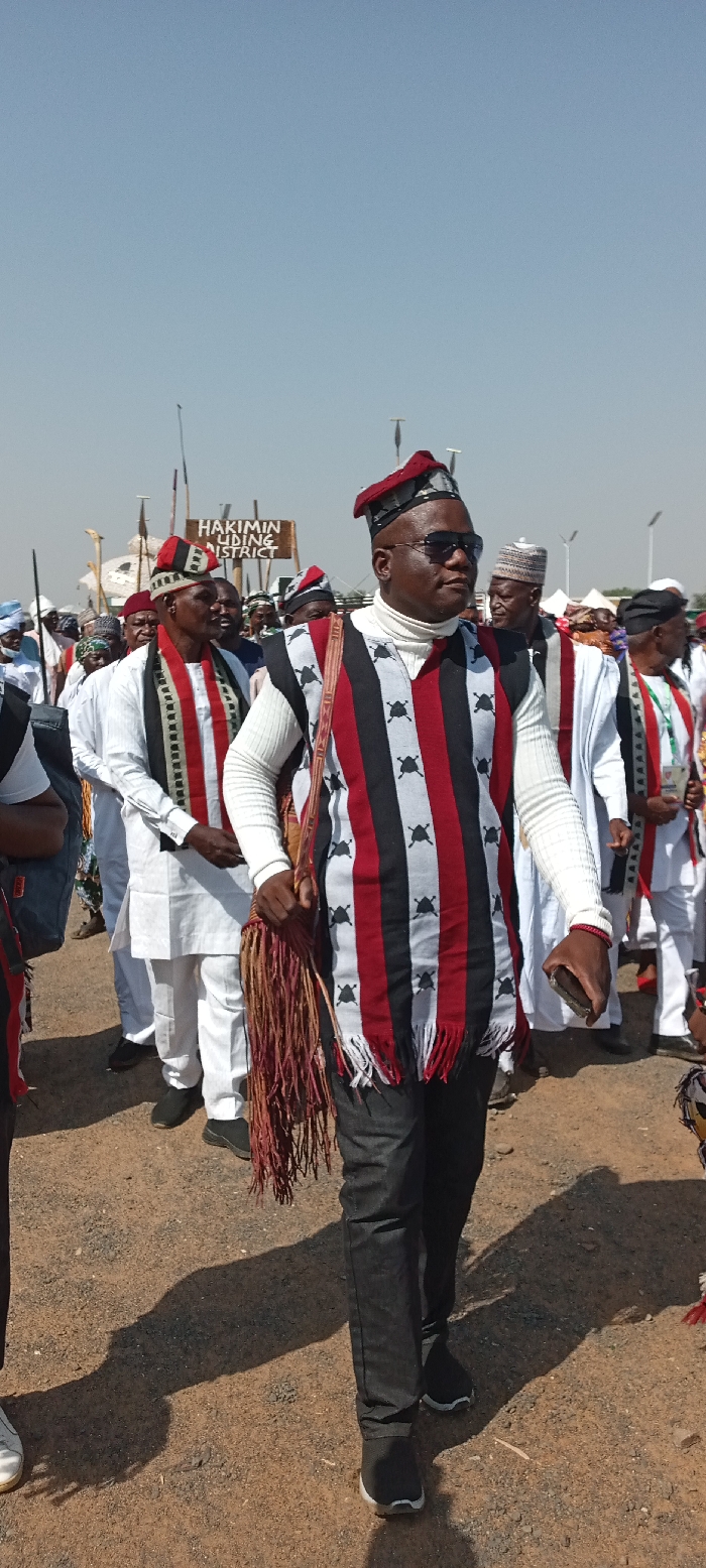 The image displays an outdoor scene in Jimeta, Nigeria, specifically in what is identified as the Uding District based on a visible sign. A dark-skinned male subject occupies the foreground, walking towards the viewer's right. He wears dark sunglasses, a red and black patterned cap, a white long-sleeved ribbed turtleneck shirt, a sleeveless vest with vertical red, black, and light grey stripes, the grey stripes featuring black skull-like or cross patterns. He has dark trousers and dark athletic shoes. A fringed bag with red, brown, and yellow threads hangs over his right shoulder, and he holds a dark smartphone in his left hand. Behind him, a procession of numerous individuals, primarily male, extends into the background. Many wear traditional white robes or tunics and caps with red and black patterns, some also featuring sashes with red, black, and white or green stripes. Several participants carry tall staffs or spears with pointed tips. A brown wooden sign in the mid-background reads "HAKIMIN UDING DISTRICT" in white capital letters. In the far background, faint white structures resembling tents and tall poles, possibly solar streetlights, are visible. The ground is dry, reddish-brown earth with small gravel. Clear shadows are cast by the individuals, indicating bright, direct sunlight. The sky is clear and light blue.