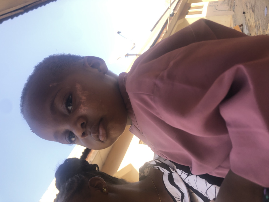 An outdoor, sunlit scene in Lokoja, Nigeria, features a young child of African descent occupying the majority of the frame, looking directly at the viewer. The child wears a plain, loose-fitting pink or mauve-colored short-sleeved top and has short, dark hair. Facial features include a neutral expression, slightly puffed cheeks, and discernible lighter, irregular patches on the right side of the face (viewer's left), along with a faint linear mark on the forehead. To the left of the child, a partial view of an adult of African descent is visible. This individual has dark skin, braided hair styled upwards, and wears a black and white patterned garment. A thin gold-colored necklace and a small, round, gold-colored earring with an intricate design are also present. The child appears to be positioned close to this adult. The background elements are under a clear, bright blue sky. A light-colored building structure with an overhang is visible behind the adult. Further back and to the right, additional light-colored buildings with at least two vertical window openings are present. A reddish-brown corrugated metal roof tops one of these structures, and two white satellite dishes are mounted near the roofline. The ground beneath the structures appears to be unpaved, consistent with dirt or sand. Strong sunlight illuminates the scene, creating bright highlights and some shadows.
