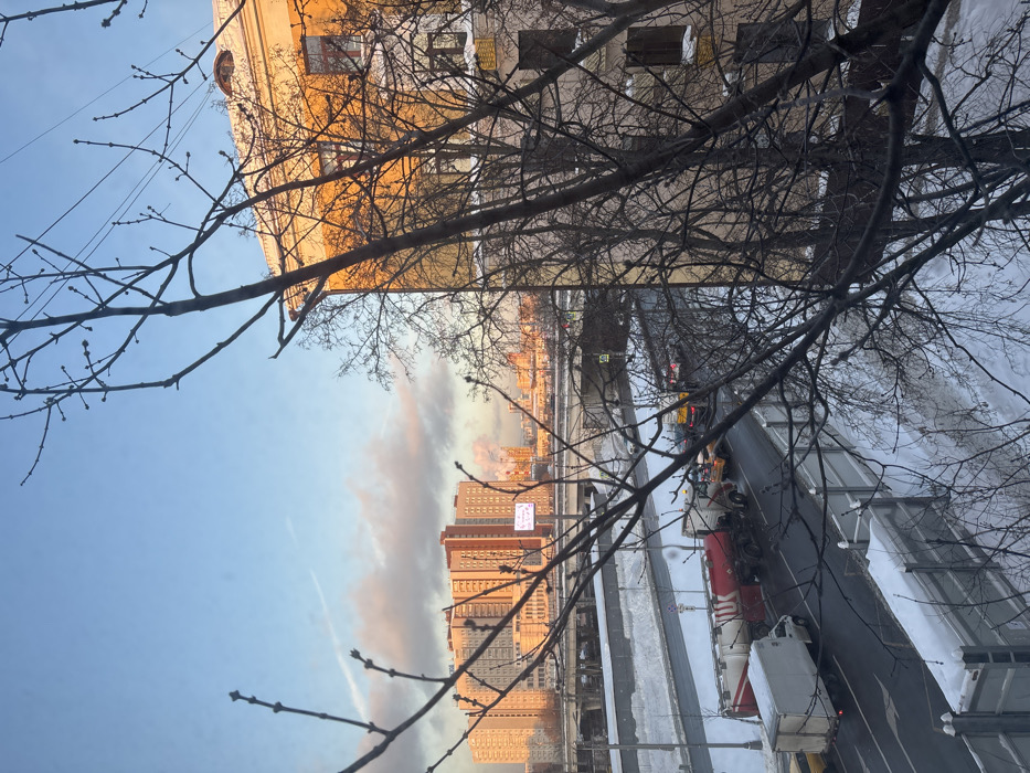 The image depicts a winter urban landscape in Moscow, Russia, specifically overlooking a multi-level section of a major roadway, likely the Third Ring Road (Третье транспортное кольцо) or a similar large artery. The scene is captured during a low-sun period, either sunrise or sunset, evidenced by the warm, golden light illuminating buildings and pink-hued clouds against a clear blue sky. In the foreground, the view is partially obscured by the leafless, silhouetted branches of a bare tree. To the right, a multi-story building with a light yellow facade, featuring multiple windows, is bathed in golden sunlight. Snow is visible on its roofline and window ledges. The midground features a multi-lane road system. The lanes are wet and partially cleared of snow, which covers the median strips and roadside areas. On the road, a white box truck is visible traveling towards the left. A prominent red and white tanker truck, bearing the "ЛУКОЙЛ" (Lukoil) logo, is positioned on the roadside or shoulder, possibly indicating an incident or maintenance stop. Its cab is white with red accents, and the tank is cylindrical, red and white. Adjacent to the tanker, a yellow service vehicle and several other passenger cars are visible, suggesting traffic congestion or a localized event. A gray barrier or sound wall runs along the right side of the road. An overpass structure is visible further back, carrying another level of road. In the background, a cluster of modern, tall residential or commercial buildings with warm-toned (orange/brown) facades are illuminated by the same golden sunlight. Beyond these structures, industrial elements, including what appear to be smoke or steam plumes, rise against the horizon. The sky transitions from deep blue overhead to a lighter blue with horizontal streaks of pink clouds near the horizon. A faint contrail is visible in the upper left portion of the sky. No individuals are discernible.
