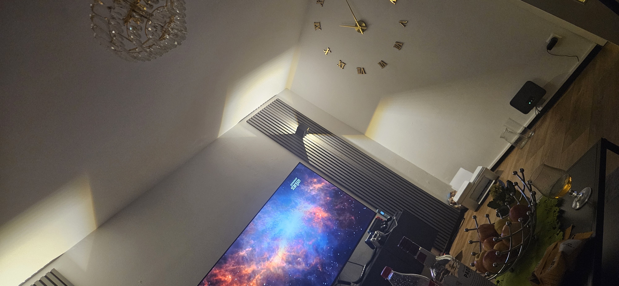 The image depicts an indoor residential living space in Gütersloh, Germany, characterized by modern furnishings and indirect lighting. The primary focus is a large, wall-mounted television displaying a cosmic image with "STINGRAY STARGATE" visible in the upper right corner of the screen. Below the television, a dark media console holds at least two Nintendo Switch Joy-Con controllers and other electronic devices. To the right of the television, a vertically oriented slatted wall panel incorporates an integrated light fixture casting an upward beam. On the adjacent white wall, a large, gold-colored wall clock displays Roman numerals and features thin gold hands indicating a time approximately past the XII. A multi-faceted crystal chandelier hangs from the white ceiling in the upper right quadrant of the image. In the foreground, a dark, rectangular coffee table is visible. On this table, a chrome fruit bowl filled with red apples and other produce rests on a green placemat. A clear glass bottle, labeled "PADO," stands next to the fruit bowl. To its right, a snifter-style glass containing an amber liquid is present. A partially visible brown bag, possibly containing snacks, is situated to the left of the fruit bowl. The floor throughout the visible area is composed of light brown wooden planks. In the mid-ground, a white printer or scanner unit sits on the floor near the wall. Further right, two clear glass vases stand on the floor, and a black network router or modem with a green indicator light is plugged into a wall outlet. No individuals are visible in the scene, and no explicit actions or interactions are depicted. The lighting, primarily from unseen sources and the television screen, creates a warm ambiance.