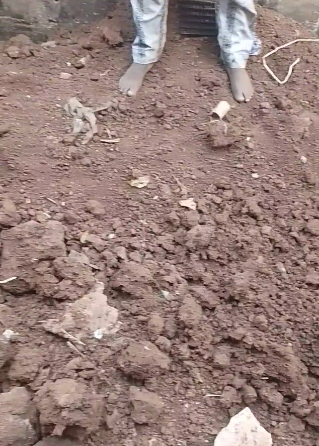 A barefoot man in black pants digs a hole in the dirt with a shovel. He is topless, lying on his side in the hole as he digs. The area around the hole is mostly dirt, with some small rocks and pieces of trash. There are two pairs of sandals visible, one on either side of the hole. The hole is against a concrete wall. The camera is positioned overhead.