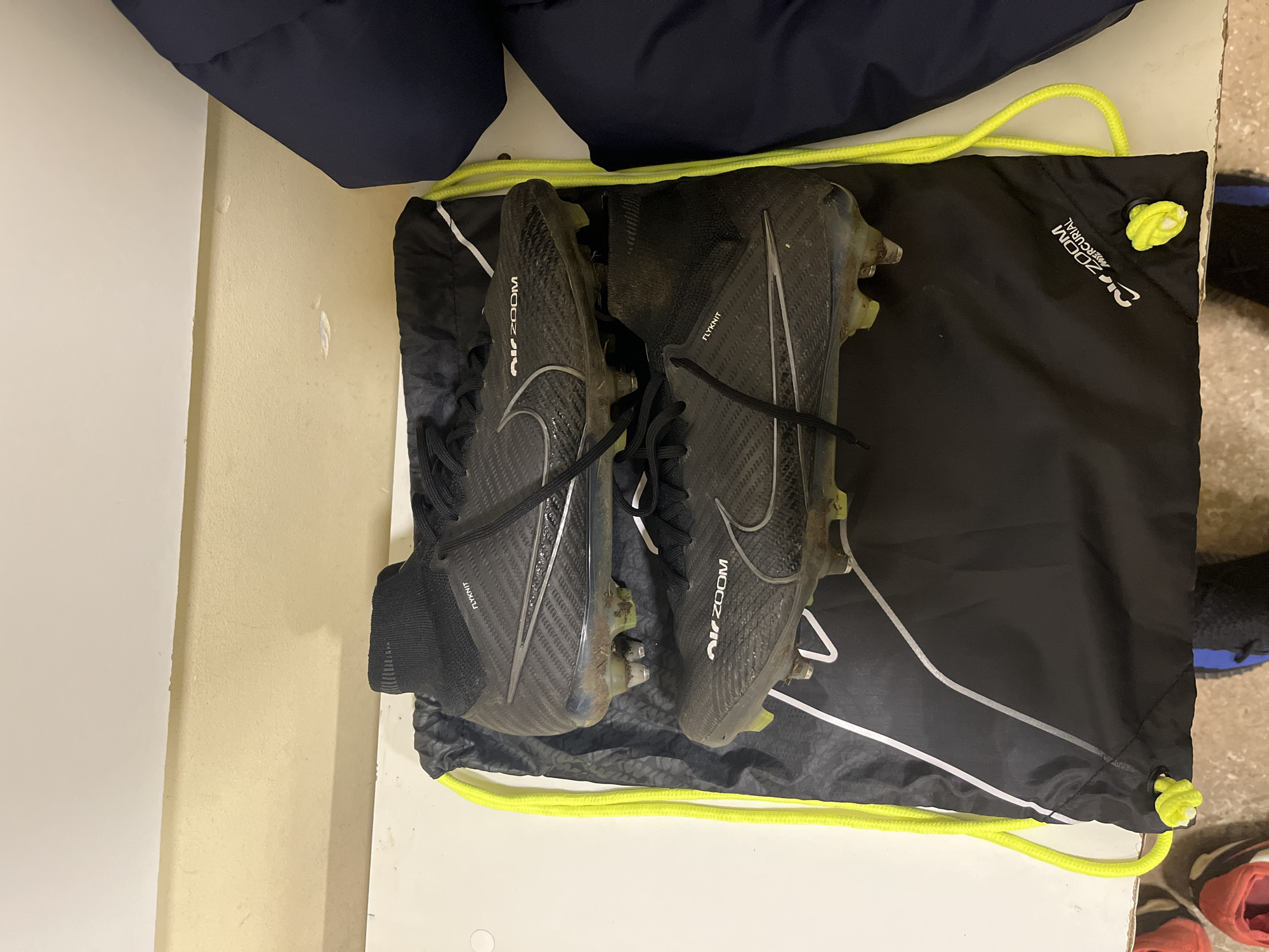 - "pair of muddy black Nike Mercurial soccer cleats sitting on a black drawstring bag" by FM-3oZ853, licensed under CC BY 4.0