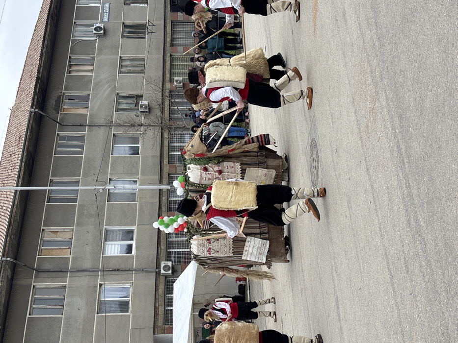 The image depicts a cultural event occurring on a paved street in Aidemir, Bulgaria
