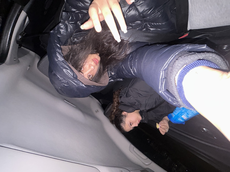 The image captures two young females seated within the interior of a vehicle, appearing to be at night or in a low-light environment