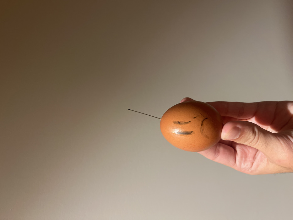 A light brown, ovoid egg with a sad face drawn in dark marker, featuring two vertical lines for eyes and an inverted U-shape for a mouth, is held by a light-skinned human hand