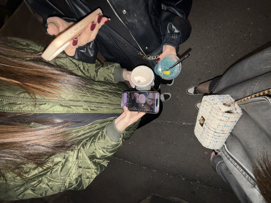 A high-angle view captures at least three individuals standing on a dark asphalt surface, likely outdoors at night or in low light. The specified location is Yerevan, Armenia; however, no specific city landmarks are discernible within the image itself. One individual, positioned centrally, wears a dark green quilted bomber jacket and displays long brown hair. This person holds a smartphone with a light purple case in their left hand, the screen actively displaying an image of two beverages (one light pink, one light blue). Next to them, on the right, another individual wears a black leather jacket. This person has dark red polished fingernails and holds a light beige smartphone case in their right hand. In their left hand, they hold a clear plastic cup containing a light blue liquid, a lemon slice, and a black straw. A white disposable beverage cup, possibly empty, is also present near the hands of these two individuals. A third individual is partially visible at the bottom of the frame, from the waist down. They wear a dark grey outer garment, dark hosiery with a vertical stripe pattern, and black-and-white sneakers. A light-colored, possibly beige or cream-toned, tweed-patterned handbag with a gold-toned clasp and a gold chain strap rests on their leg. The scene depicts individuals holding personal items and beverages in a casual group setting.