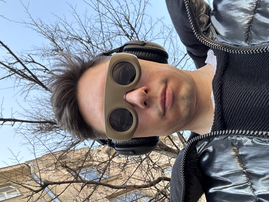 A male individual is depicted in an upward-angled close-up selfie in an urban environment within Vilnius, Lithuania. The subject, appearing in profile, has short, dark, textured hair and a neutral facial expression. He is wearing distinctive beige-brown framed sunglasses featuring a double-lens design, with two circular dark lenses on each side. Black over-ear headphones are positioned on both ears. The individual is dressed in a shiny black puffer jacket with a visible front zipper, layered over a dark, possibly black, textured garment, beneath which a lighter-colored (grey or white) collar is visible. The background features a clear blue sky, numerous bare tree branches, and a light-colored multi-story building with visible windows on the upper left, indicative of a typical urban residential or commercial structure in Vilnius.