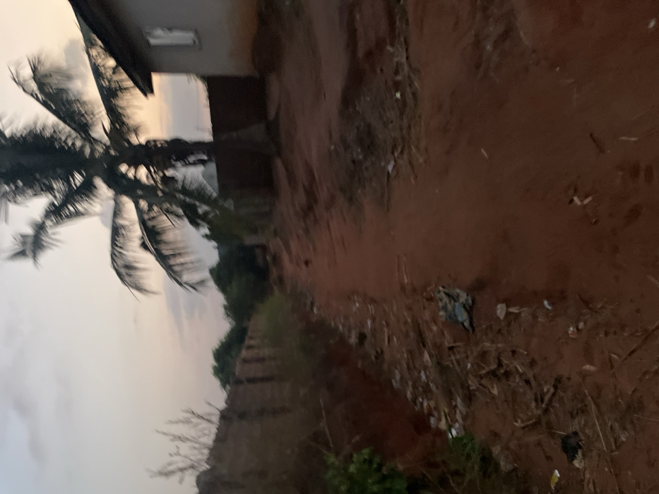 A sandy, dirt path runs alongside a small, weathered building and a fence obscured by vegetation. Litter is scattered along the path. A tall palm tree leans over the building, its fronds swaying in the breeze. The sky is dusky, suggesting either dawn or dusk. The scene appears to be in a rural or tropical setting.