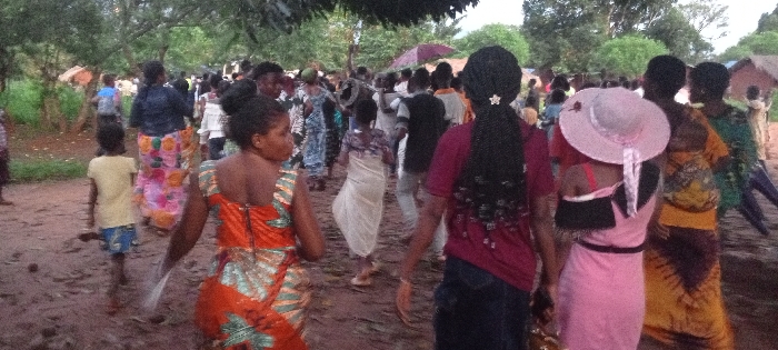 A crowded outdoor scene shows people gathered on a dirt ground with greenery visible. The crowd consists of adults and children, many dressed in colorful or patterned fabrics. Several individuals are wearing dresses, including one in a pink dress and a wide-brimmed hat. The scene gives off an atmosphere of community and festivity.