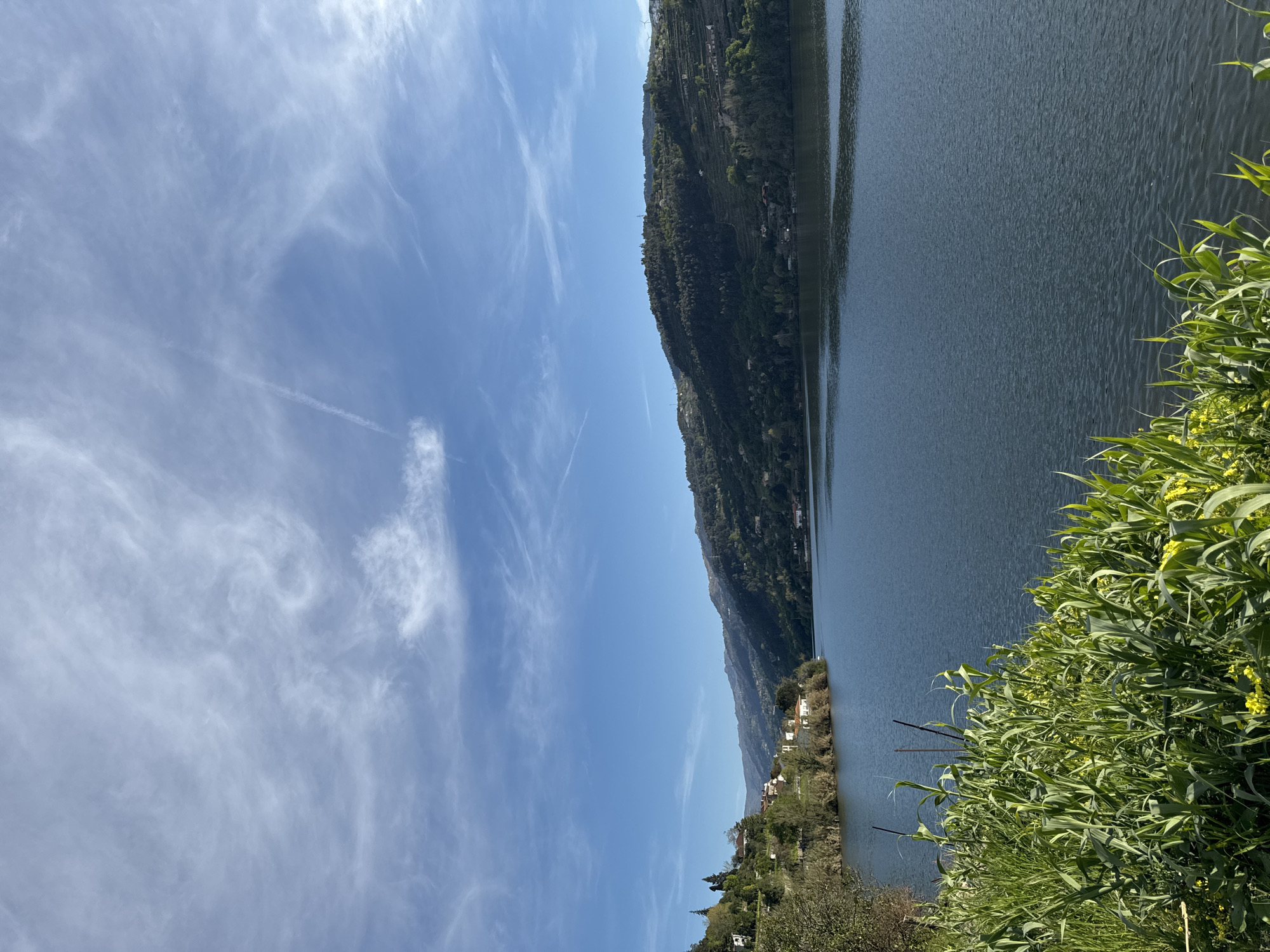 body of water, possibly a river or lake, adjacent to a hillside in Baião, Portugal. The sky is blue with wispy clouds, including a contrail. The hillside features green vegetation. On the water's edge are green plants. A village sits at the base of the mountain.