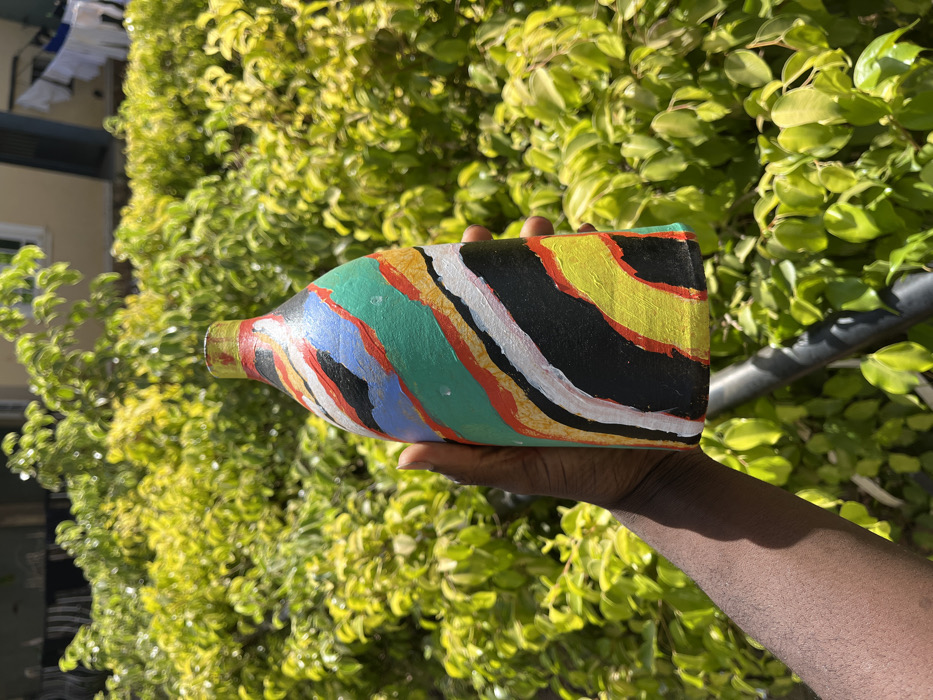 A dark-toned human hand holds an upright, painted bottle in an outdoor setting in Sabon Tasha, Nigeria. The bottle features an abstract pattern composed of curved and diagonal bands of black, white, red, yellow, green, and blue paint, with visible metallic sheen in some areas. The immediate background consists of bright, out-of-focus green foliage. In the upper background, a section of a light-colored building with windows is visible, along with white laundry items hanging on a line. The scene is illuminated by strong directional sunlight, casting distinct shadows from the hand and the bottle.