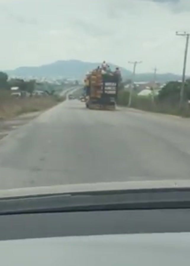 view from inside a moving car looking at a truck ahead on a road. The truck is overloaded with cargo, appearing to be stacked boxes, and has several people riding on top of the load. The road is paved with visible cracks and patches. In the background, there are hills, scattered buildings, and power lines running alongside the road. The sky is overcast, suggesting a cloudy day.