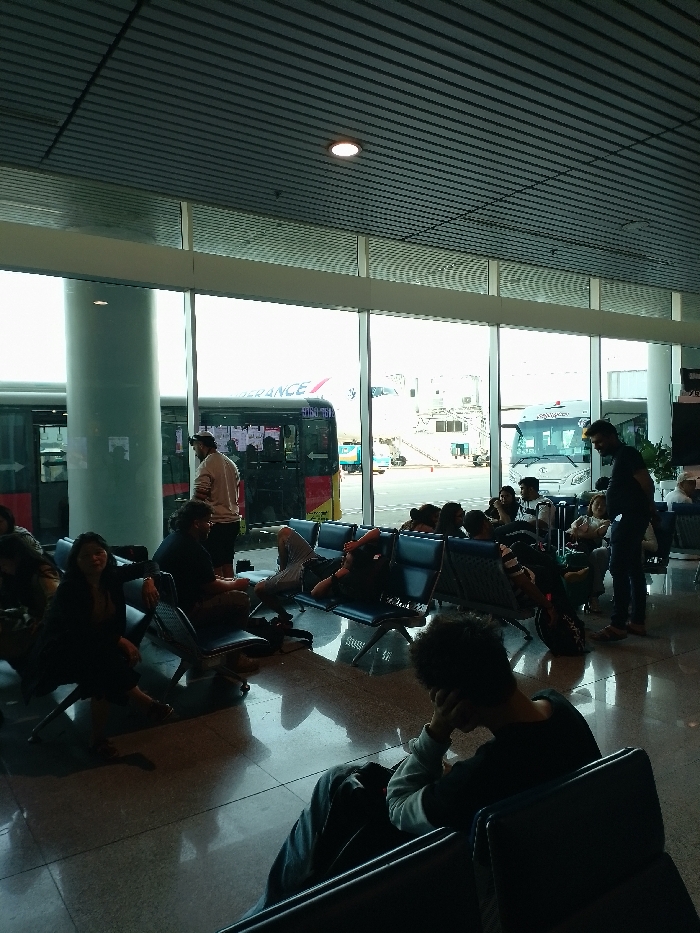 People are waiting in an airport terminal. Several passengers sit in rows of blue chairs, some looking out the large windows. Outside, airport buses are visible, one with "FRANCE" printed on it. Others stand or chat, partially obscured by chairs and luggage. The scene is lit by natural light streaming through the windows, creating a bright but somewhat dim atmosphere indoors. The ceiling is modern with visible ventilation.