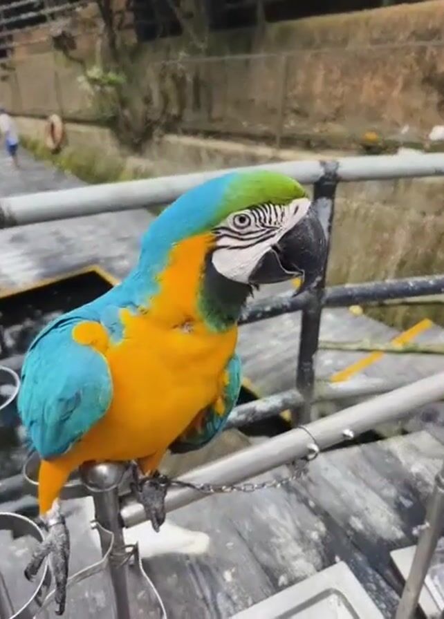 A blue and yellow macaw is perched on a silver metal railing in an outdoor area. The parrot's head is mostly blue with a green patch on top, and it has a black beak. Its body is bright yellow with blue wings. The railing is part of a structure that appears to be over a body of water, with a walkway and other structures visible in the background. In the distance, there are a few blurry figures of people walking. The scene is captured with a slightly shaky camera movement, providing a close-up view of the parrot.