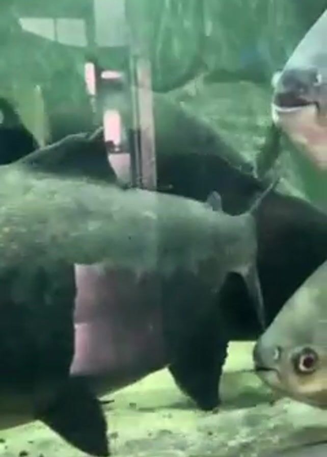 fish in an aquarium. There are several large, gray fish with prominent eyes and upturned mouths. They swim near the glass, giving the viewer a close look at their faces. Other fish are visible in the background, including one that is lighter in color. The aquarium appears to be lit, with a sandy bottom and some wood or branch-like structures present. Voices can be heard in the background.