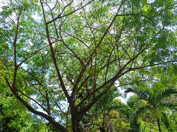 A dense canopy of lush green leaves filters the bright sunlight. The intricate network of dark brown branches creates a complex pattern against the sky. Palm trees are partially visible in the lower right corner, adding to the tropical feel. The perspective is from below, looking upwards into the vibrant foliage. The overall impression is one of natural beauty and tranquility.