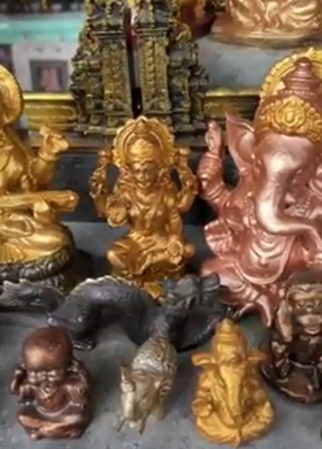 display of small, colorful Hindu statues. The statues are gold, pink, brown, and black. Some are of the elephant-headed god Ganesha, while others are of the goddess Lakshmi. There are also some statues of Hanuman, the monkey god. A hand reaches into the frame and gestures toward one of the golden statues of Ganesha. The statues are arranged on a table.