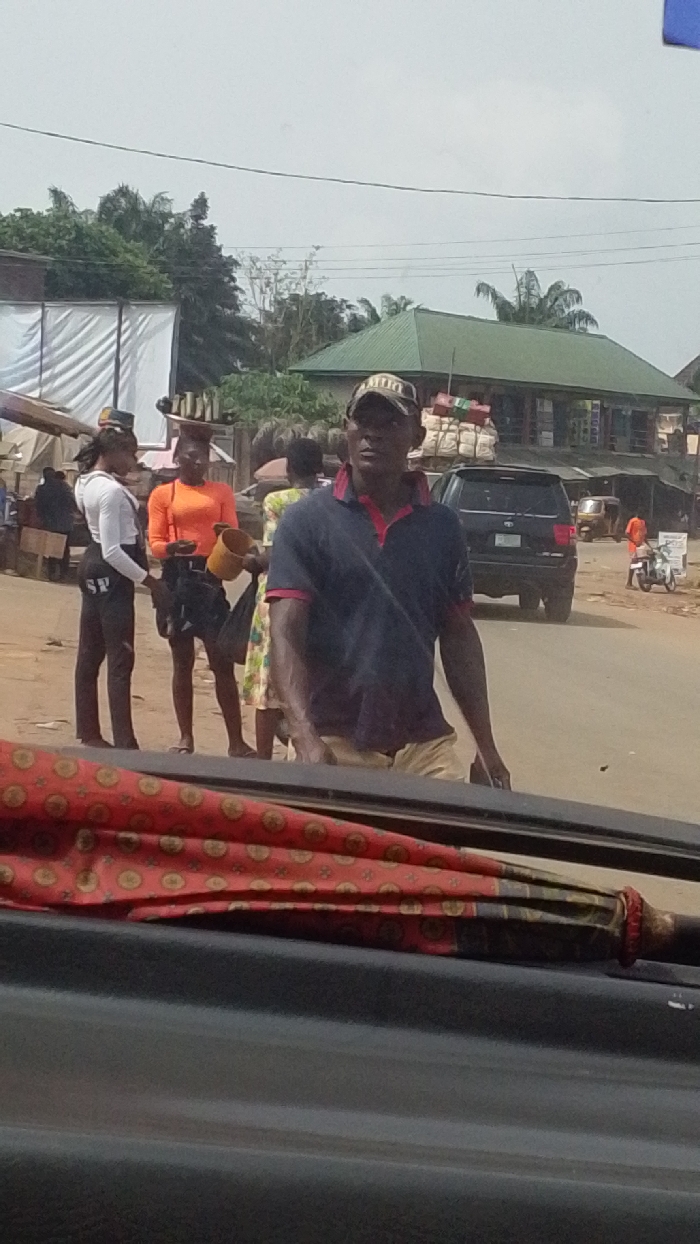 The image depicts a daytime street scene in Igbo Ukwu, Nigeria, observed from within a vehicle