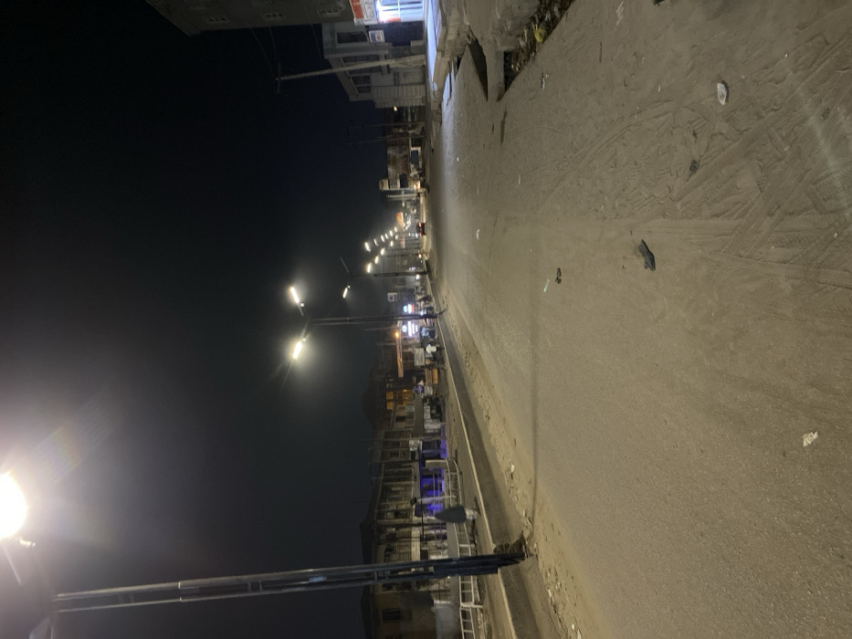 The scene depicts a street at night in Sabon Gari East, Nigeria. A wide, two-lane asphalt road stretches into the distance, illuminated by multiple overhead streetlights featuring bright, cool-toned LED luminaires. The sky above is dark. The road surface exhibits scattered debris, including several dark, shoe-like objects and white plastic remnants, along with visible tire tracks. A raised, concrete median or barrier separates the immediate left foreground from the main road, also showing dirt and minor debris. On the far left, beyond the median, a row of multi-story commercial or mixed-use buildings line the street, some displaying internal or sign illumination in blue and white. At least two individuals are visible on the left side of the road near these structures; one figure in a light-colored garment is more distinct. On the right side of the road, a raised concrete sidewalk with drainage grates and accumulated dirt and trash runs parallel to the street. Further down, buildings with illuminated storefronts are visible. A prominent, multi-story building with multiple windows is situated on the far right. In the distance, a single vehicle with illuminated headlights is observed moving away from the viewer, while other faint vehicle lights are also visible. Indistinct pedestrian figures are observed on the right side of the street further down the road.