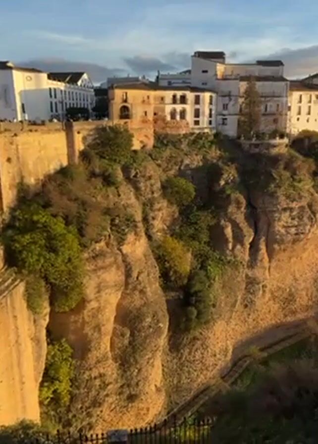 panning shot of a city on a cliff. The city buildings are mostly white with brown roofs. The cliff is steep and covered in vegetation. There is a path running along the side of the cliff. The sun is shining and the sky is blue. There is a bridge in the foreground.