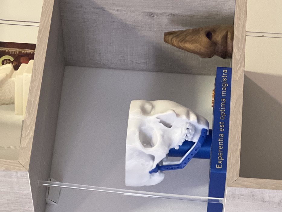 An interior scene in Yerevan, Armenia, displays various objects on two light wood laminate shelves against a light grey wall. On the lower shelf, a white 3D-printed model of a human half-skull and half-face is positioned centrally. The left side of the model presents the cranial and facial bones, with a blue, multi-holed orthopedic plate attached to the mandible. The right side depicts a smooth facial contour. This model rests on a blue rectangular base inscribed with "Experentia est optima magistra" in gold lettering. To the right of the model, a dark brown, abstract wooden sculpture, shaped like a prominent nose and mouth, stands vertically. On the shelf directly above, partially visible objects include a white, possibly marble or plaster, statue fragment on the left and a framed religious icon depicting a robed figure with a halo on the right.